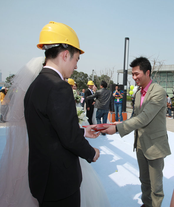 艷陽高照,在美麗的月湖之畔,一段熱舞拉開了集體婚禮的帷幕。踏著神圣的婚禮進(jìn)行曲,八對新人依次入場。執(zhí)子之手、與子偕老,新人們在領(lǐng)導(dǎo)和親朋好友的見證下發(fā)表了愛的宣言。新娘為新郎帶上象征著安全和責(zé)任的安全帽,而新郎則為新娘套上代表忠貞不渝的愛的戒指,在大家祝福的掌聲中,新人們熱烈擁吻,將婚禮氣氛推向高潮。