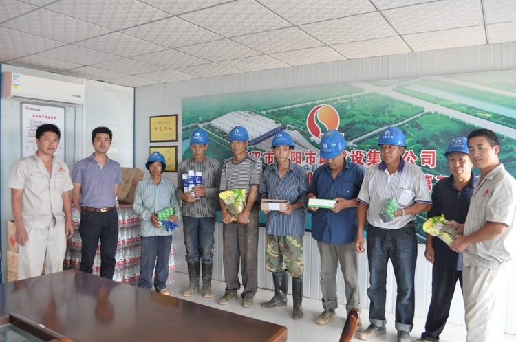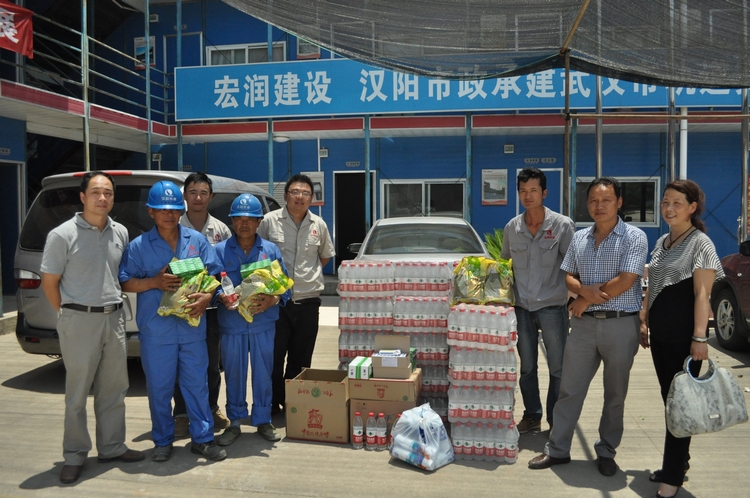 6月17日,武漢市氣象局發(fā)布高溫黃色預(yù)警。鐘鑫公司立即開展了夏季高溫慰問活動(dòng)。當(dāng)天下午,公司經(jīng)理王智高、書記王繁、副經(jīng)理鄭佳、尹艷軍、徐浩及工會(huì)干部等領(lǐng)導(dǎo)一行冒著高溫酷暑慰問漢口北地鐵項(xiàng)目部。在漢口北項(xiàng)目部,王智高經(jīng)理等領(lǐng)導(dǎo)把礦泉水、綠豆、白糖等物資和防暑降溫藥品發(fā)放到農(nóng)民工手中,并叮囑項(xiàng)目部一定要保證農(nóng)民工在高溫時(shí)期安全作業(yè),防暑降溫物資要有限用于農(nóng)民工。隨后兩天時(shí)間里,公司領(lǐng)導(dǎo)同志有先后為三號線六標(biāo)地鐵項(xiàng)目部、玉龍路地鐵項(xiàng)目部以及江鸚路道路維修項(xiàng)目部、佛祖嶺一路項(xiàng)目部和書城路項(xiàng)目部,并對現(xiàn)場農(nóng)民工進(jìn)行慰問。