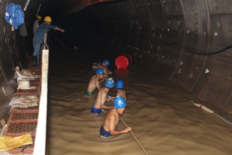 7月7日災(zāi)情發(fā)生后,玉龍路地鐵東段頭井基坑積水?dāng)?shù)米深,項(xiàng)目部立即投入排水搶修工作,集團(tuán)公司董事長(zhǎng)胡紅勝親自帶隊(duì)搶險(xiǎn),抽調(diào)十余臺(tái)大型抽水泵、25噸泵車到施工現(xiàn)場(chǎng),項(xiàng)目經(jīng)理及現(xiàn)場(chǎng)管理人員一人負(fù)責(zé)一臺(tái)抽水泵的拼裝,綁鐵絲、擰螺絲,自己動(dòng)手,公司總經(jīng)理王智高、支部書(shū)記王繁親自安排抽水泵下井工作,經(jīng)過(guò)三十多個(gè)工人三天的艱難搶險(xiǎn),終于將隧道中積水排出,一個(gè)星期后成功搶救出被淹沒(méi)的盾構(gòu)機(jī)。之后盾構(gòu)維修人員不畏艱難,跟泥土和水災(zāi)作戰(zhàn),將一個(gè)個(gè)零件拆下來(lái)進(jìn)行清洗檢修,公司還從海瑞克公司專門聘請(qǐng)兩名專職技術(shù)人員現(xiàn)場(chǎng)指導(dǎo)維修,電氣系統(tǒng)更換配件,重新調(diào)試,液壓系統(tǒng)也送到專業(yè)維修機(jī)構(gòu)進(jìn)行清洗維修,一個(gè)多月里解決了一個(gè)又一個(gè)難題,終于將盾構(gòu)機(jī)修好,具備再次始發(fā)的條件。