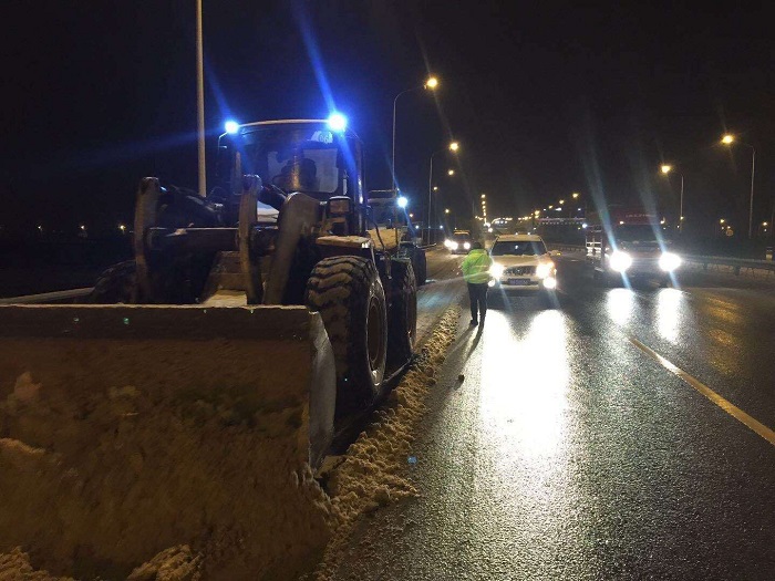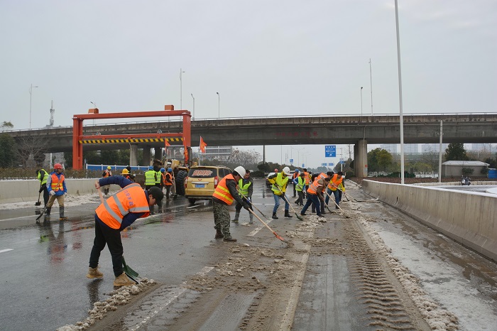 時間來到27日晚上23時,在三環(huán)線白沙洲大橋——國博大道路段,漢陽市政鐘鑫公司的搶險隊伍在漢陽市政集團(tuán)副總經(jīng)理、鐘鑫公司董事長方紫微的帶領(lǐng)和指揮下,克服白天一整天抗雪搶險的疲憊感,緊急調(diào)度機(jī)械設(shè)備和搶險人員,連夜前往搶險路段奮戰(zhàn)3小時,在寒冷冬夜順利完成了搶險任務(wù)。