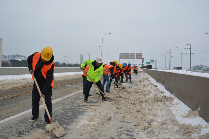 時間來到28日上午8時,在三環(huán)線百威路—長豐橋路段,鐘鑫公司迅速調(diào)度六大項目部150人和鏟車、農(nóng)用車數(shù)臺,集體前往三環(huán)線高架進(jìn)行除雪破冰。8點鐘的三環(huán)線高架,格外清冷,最低溫度甚至達(dá)到了零下6度!可是當(dāng)你置身于搶險現(xiàn)場時,卻完全感覺不到寒意——只因為大家全身心的投入到搶險工作中,一把把鐵鍬揮舞得那么有力,一條條產(chǎn)雪破冰后的路面是那么干凈整潔,現(xiàn)場氣氛是那么的熱烈。期間更是迎來了漢陽區(qū)委書記馬澤江、漢陽市政集團(tuán)公司董事長嚴(yán)悌文等領(lǐng)導(dǎo)來到搶險現(xiàn)場指揮工作,為正在搶險的“鐵軍”們鼓勁加油,大家干勁更足了,精神更振奮,最終在下午13:30將三環(huán)線百威路—長豐橋路段路面積雪清掃完畢。