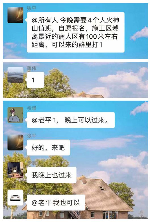 就在一線人員集中隔離之時(shí),2月9日晚,從前線傳來需要人員留守夜班執(zhí)勤的緊急消息,在這個(gè)離隔離病房最近僅有50米的區(qū)域,危險(xiǎn)無處不在。來不及考量,也來不及思索,“我可以”、“我過來”、“+1”的消息瞬間在工作群刷屏,參與火神山建設(shè)后正在隔離中的鐘鑫建設(shè)者紛紛響應(yīng),報(bào)名參加,選擇與危險(xiǎn)同行、與責(zé)任相伴,以責(zé)任擔(dān)當(dāng)詮釋了什么是“最美建設(shè)者”。“沒有什么累不累,哪里需要我,我就站在哪里”“在這種關(guān)鍵時(shí)期,能貢獻(xiàn)一份力量就必須站在前面,我們做的是為了盡早打贏這場疫情阻擊戰(zhàn)”,舍生忘死、沖鋒在前,他們用最美逆行踐行著保家衛(wèi)國、抗擊疫情的錚錚誓言。