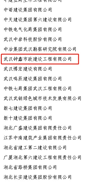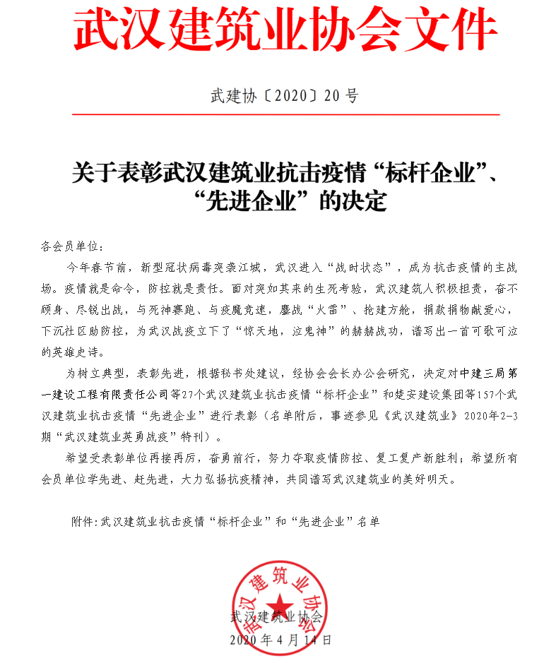 近日,武漢建筑業(yè)協(xié)會發(fā)布《武建協(xié)20號——關(guān)于表彰武漢建筑業(yè)抗擊疫情“標(biāo)桿企業(yè)”、“先進(jìn)企業(yè)”的決定》,對在抗疫“主戰(zhàn)場”積極擔(dān)責(zé),奮不顧身、精銳出戰(zhàn),與死神賽跑、與疫魔競速的27家武漢建筑業(yè)“標(biāo)桿企業(yè)”、157家“先進(jìn)企業(yè)”進(jìn)行表彰。漢陽市政鐘鑫市政公司在抗疫過程中主動作為、勇于擔(dān)當(dāng),獲評“先進(jìn)企業(yè)”榮耀稱號。