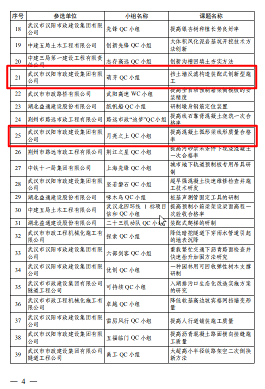 6月4日,從湖北省市政工程協(xié)會(huì)再次傳來捷報(bào),2020年度漢陽市政鐘鑫公司參評(píng)的6項(xiàng)QC成果均獲得獎(jiǎng)項(xiàng),其中一等獎(jiǎng)3項(xiàng),二等獎(jiǎng)2項(xiàng),三等獎(jiǎng)1項(xiàng)。