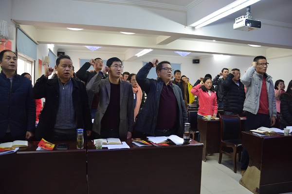 會議伊始,涂書記通報(bào)黨員到會和11月份黨費(fèi)交納情況,全體黨員齊唱國歌。在涂書記帶領(lǐng)下全體黨員重溫了入黨誓詞,一起誦讀黨章第七章《黨的紀(jì)律》,聲音鏗鏘有力,高亢嘹亮。