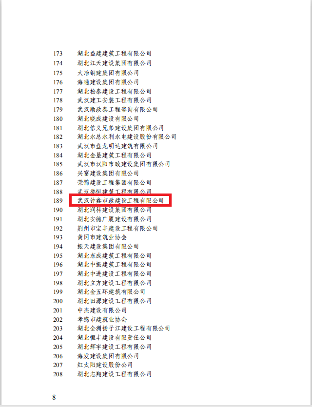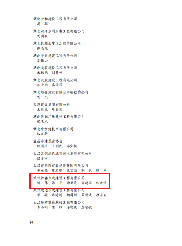 2020年8月24日,湖北省建筑業(yè)協(xié)會發(fā)布《關于表揚抗擊新冠肺炎疫情表現(xiàn)突出的先進集體和個人的通報》(鄂建協(xié)202042號),鐘鑫公司榮獲抗擊新冠肺炎疫情表現(xiàn)突出的先進集體稱號;鐘鑫公司林光洪、魏偉、張平、李衛(wèi)民、宋建國榮獲抗擊新冠肺炎疫情表現(xiàn)突出的先進個人稱號。