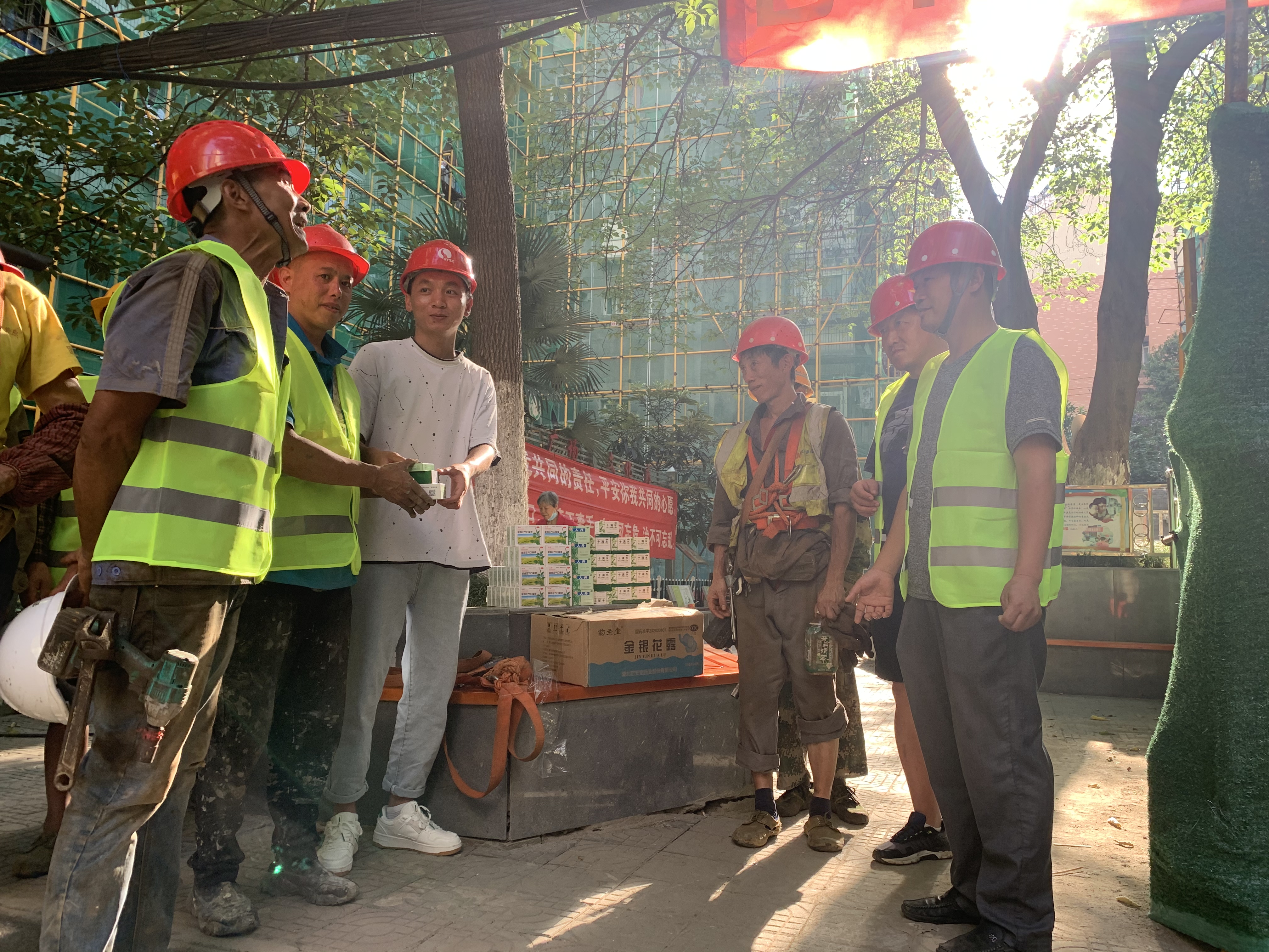 持續(xù)近40度的高溫天氣對一線建設者而言是一場體力和毅力的考驗。為保證高溫天項目安全作業(yè),鐘鑫公司在各項目啟動夏季施工防暑降溫措施,通過召開班組會議,及時調整施工計劃,靈活搶抓工期,在做好工人勞動保護的同時,全力確保項目順利推進。各項目盡量避開中午時間,利用早上和下午時間緊抓工期,還為一線施工人員準備鹽汽水、藿香正氣水、涼茶、酸梅湯等防暑降溫食品、藥品,保證項目一線員工擁有絲絲清涼。