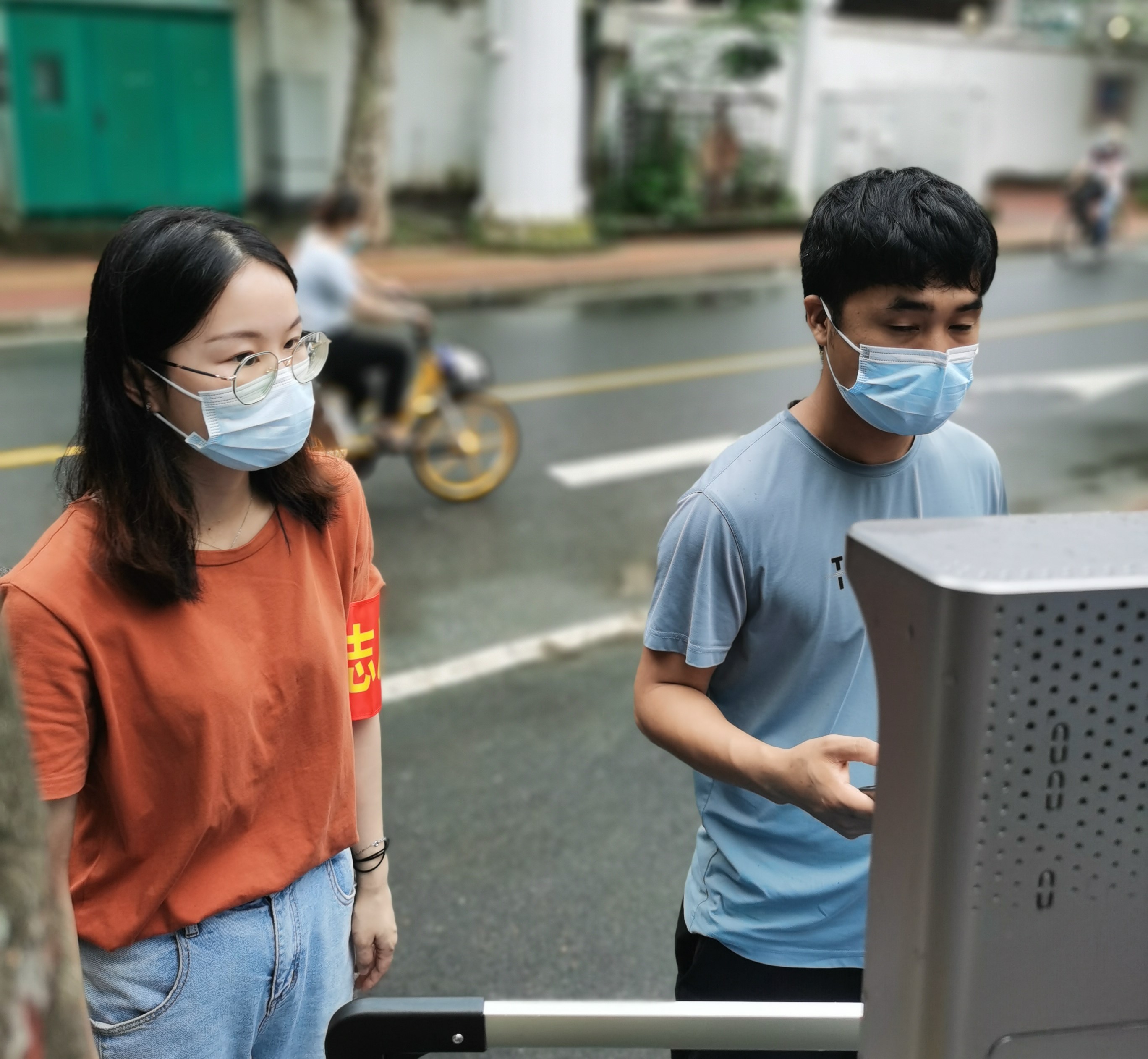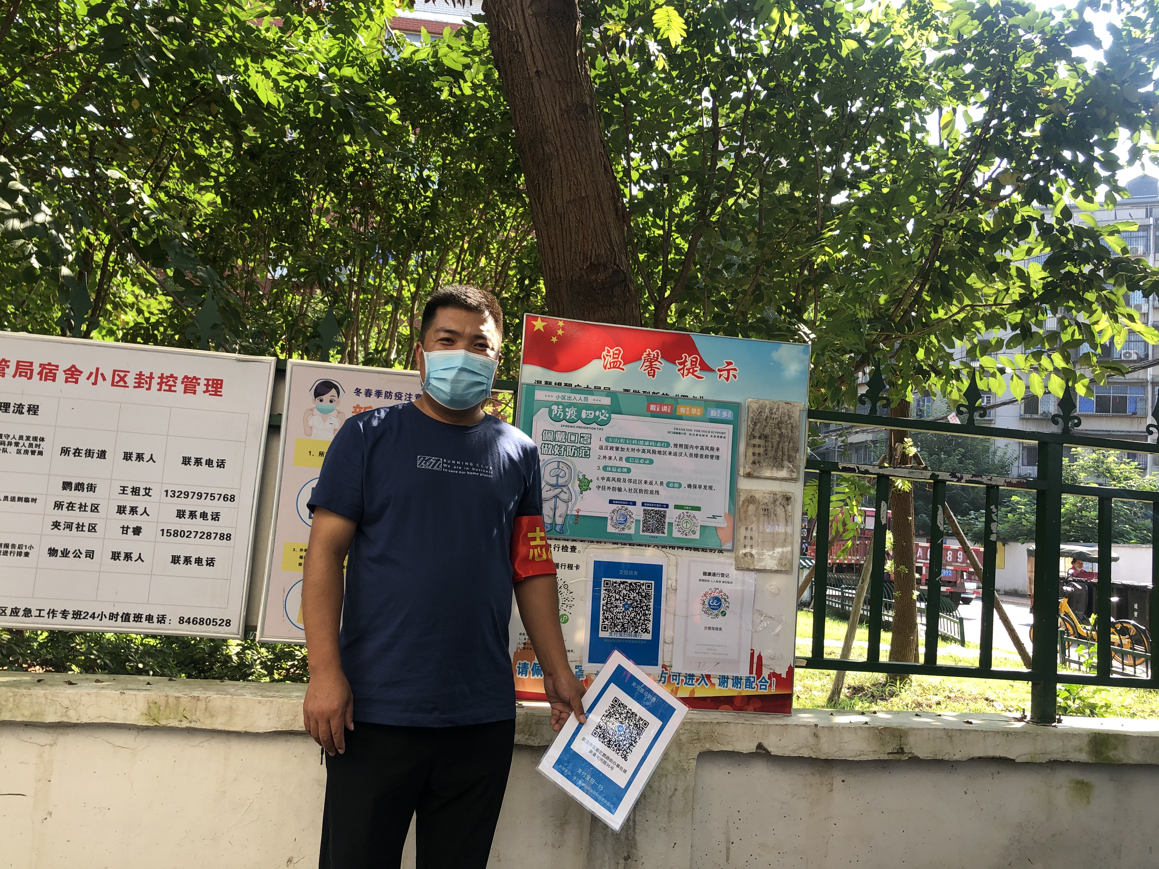 風(fēng)塵仆仆再戰(zhàn)社區(qū),剛從建設(shè)現(xiàn)場回到崗位的黨員李強(qiáng)、楊潔,立刻趕往社區(qū),力求在繁忙的工作之余能夠?yàn)樯鐓^(qū)貢獻(xiàn)自己力所能及的力量。烈日炎炎下,他們嚴(yán)格要求進(jìn)入小區(qū)的人員必須持健康碼,守好疫情防控的第一道關(guān)口。