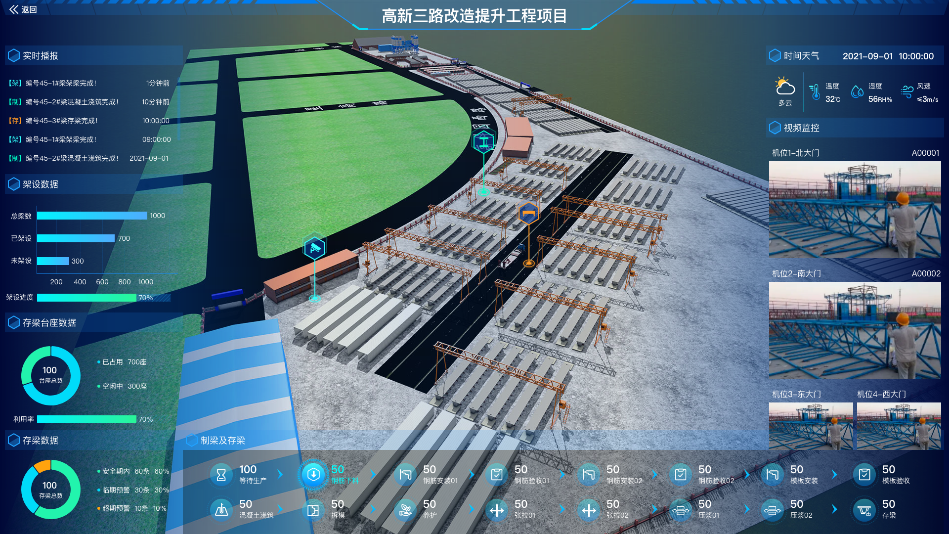 二是智慧梁場系統(tǒng)結(jié)合工程實際、漢陽市政BIM中心,運用視頻監(jiān)控、平臺信息實時掌握材料、制梁、存梁及架設(shè)等全過程,平臺系統(tǒng)實現(xiàn)網(wǎng)頁、手機移動端聯(lián)動管理,為橋梁施工提供智慧大腦。